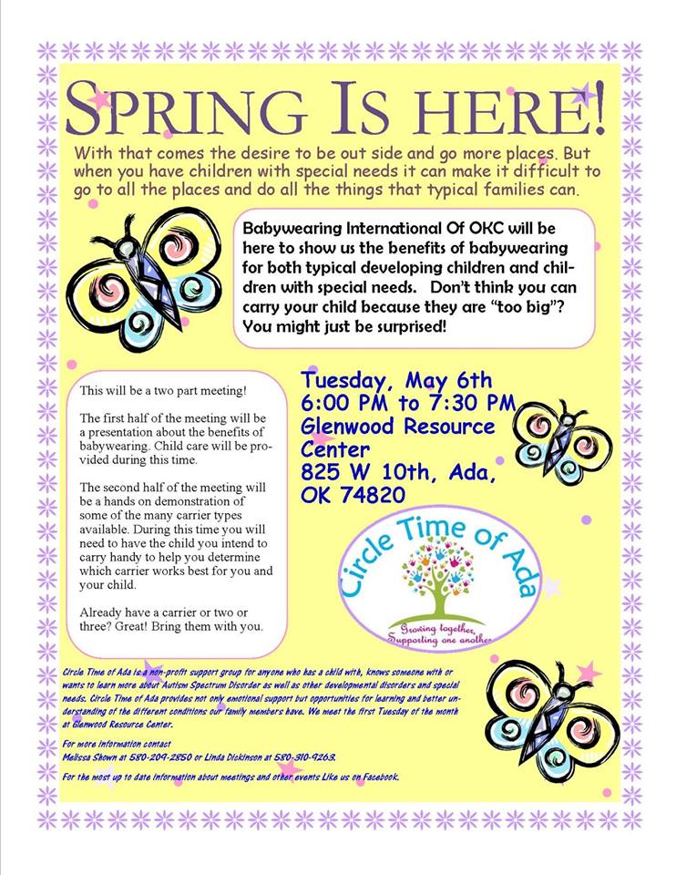 Well, it’s finally almost here. We will be in Ada, Oklahoma on May 6th for a lecture and presentation of babywearing for the special needs population. Hoping to be able to give these great parents another parenting tool for their very complicated parenting toolbox. Wish us luck!